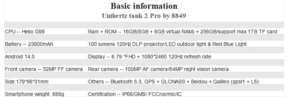 Unihertz tank 2 Pro 8849 rugged phone with projector 100MP 24GB 256GB Android 14 100MP NFC 120W Helio G99 23800mAh
